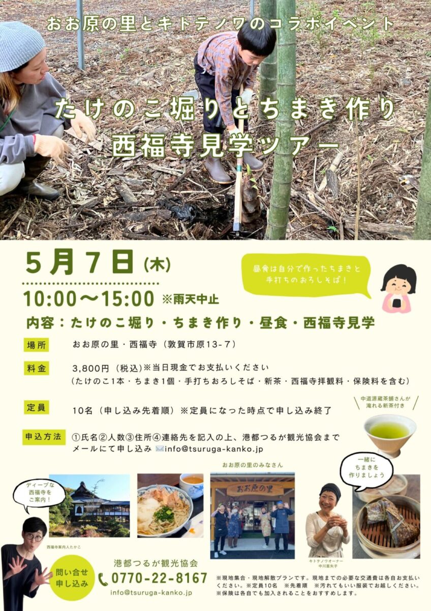 「たけのこ堀りとちまき作り&西福寺見学ツアー」参加者募集! 原地区のおお原の里にて、地元の方と一緒にたけのこ堀り!キトテノワのオーナーと一緒にちまきを作り、お昼ごはんに手打ちそばと一緒にいただきます。中道源蔵茶舗さんが淹れる新茶付き!その後は案内人たかこが西福寺をご案内する盛りだくさんなツアーを開催!ぜひご参加ください。